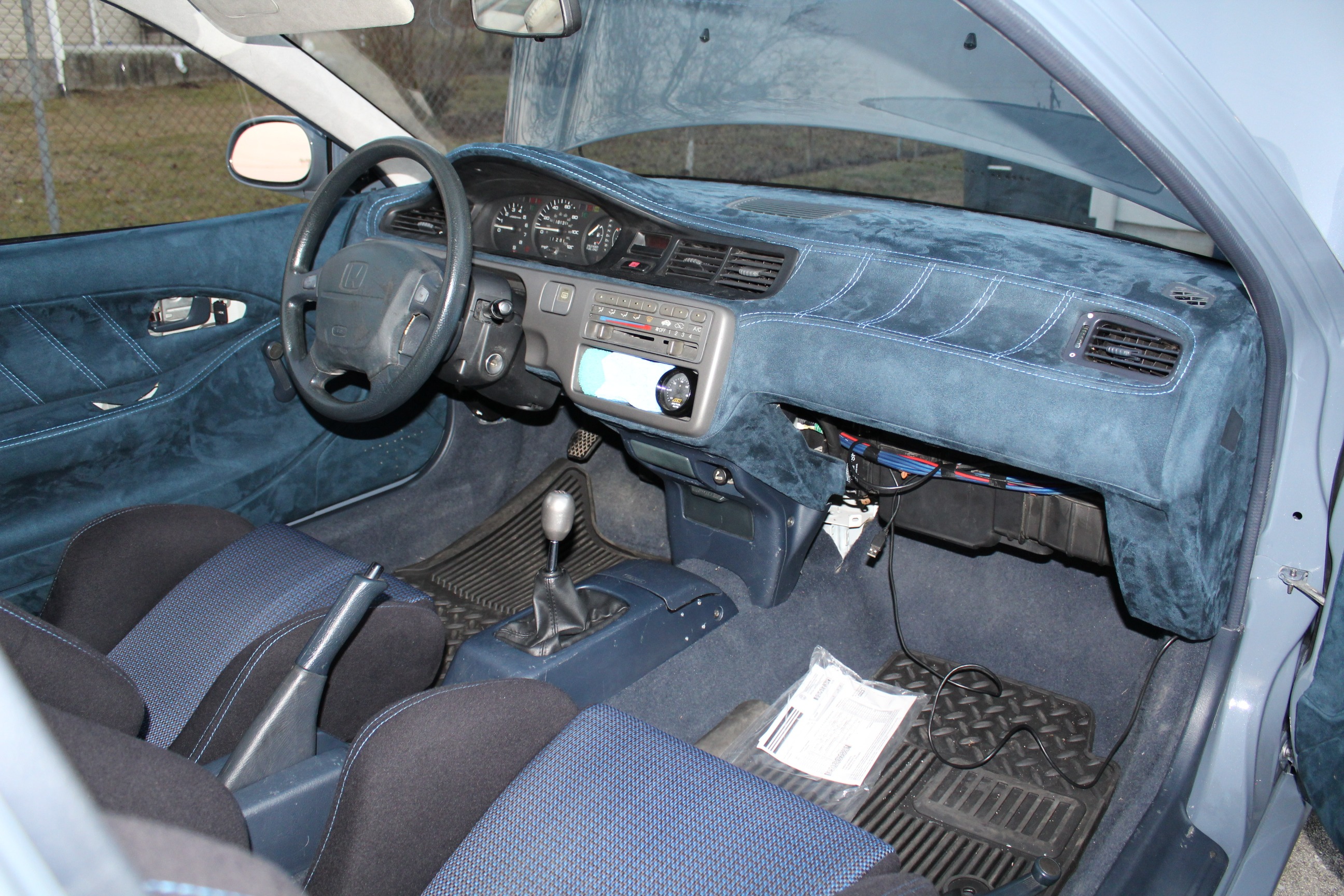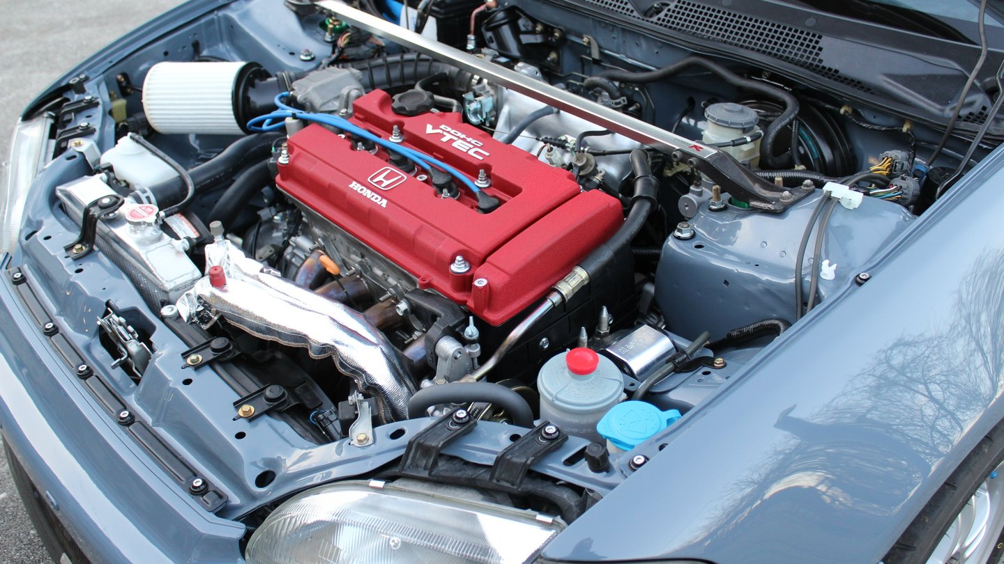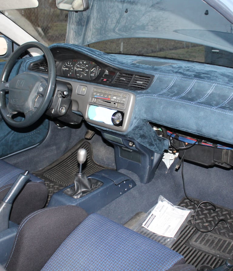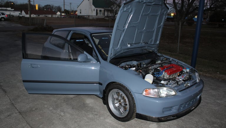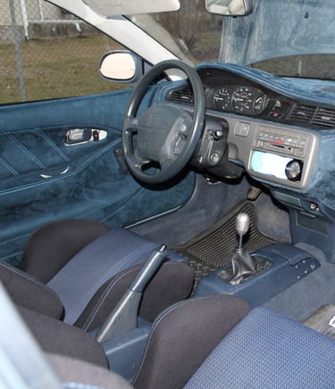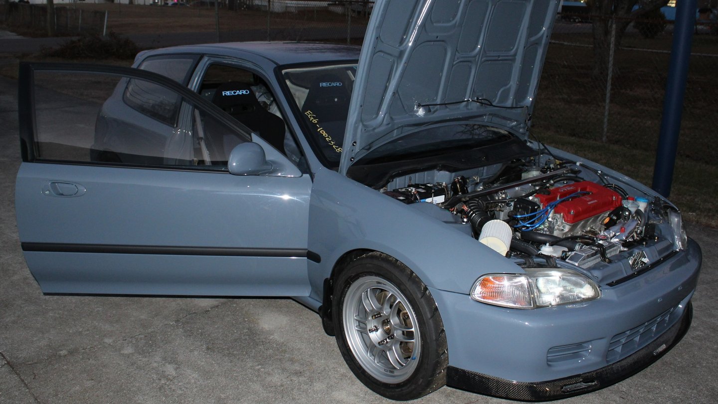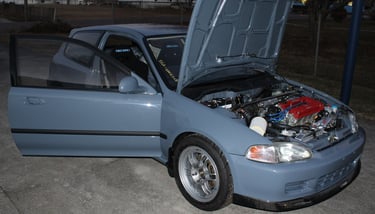 A no expense spared dream build for this owner was a 1992 Honda Civic EG hatch in Porsche Graphite Blue capable of 1000hp when turbocharged thanks to a Golden Eagle sleeved B16A 1.6 liter (84mm bore) four pot. Seen here in naturally aspirated trim, the Civic is planned to stay in its current configuration until the suede interior is finished.